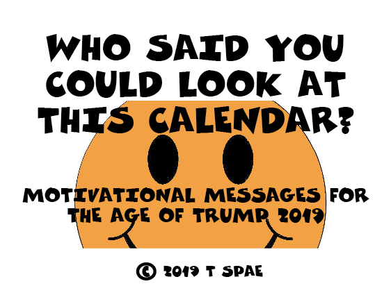 The Calendar (The Long Way Around)1/12/19Well, here we are. It's me again. Apparently I've had nothing to say worth converting to webfroth these past two years. And who could blame me? Come to think of it, who even cares? Everyone's gone to the circus — y'know, the 24/7 three ring fiesta of dung that's ensued since reeeeeeealiteeeee teeeveee took over Washington DC. How could I have hoped to compete with that? They've got nukes and everything. I don't even have the saving grace of having formally called a halt to the whole slapstick parade like I did in 2000. I just kinda stopped. I've seen it written that a majority (like, "all but 20") blogs do this same trajectory, long and strong and getting the friction on for a couple years, then bupkis. My own efforts appear to be somewhere midstream with the rafts of floating debris and the crocodiles: better than most, but no brass ring. Aw, who needs a brass ring anyways? It'd just turn your finger green. But the habit of inactivity, strong though it may run in my slackster veins, has nary a patch on that yet stronger habit of logorrhea under whose yoke and lash I've long endured my mizzable existence. I've probably used that reference before in other contexts. Do I repeat myself? Very well, I repeat myself. I am vast. I contain redundancies. Wha? knows I've had more than a couple gymcrack notions suitable for essays trip lightly through my microscopic attention span, flip me the bird and trip right out again. But it's not as though I haven't had a bunch of other things to distract me, in particular the big remodel job that utterly superseded my indulging in flabfaced gasbag discourse last year. I was lucky to keep up with music, and music actually pays. Sometimes. Not too much. Mostly vegetables. And yet, I persist. And in persisting, I've engaged the notion that there might be a dance or two left in the art of blabbage. In contrast to music, its tools are simple and direct: letters on paper, keystrokes in a file. Looks easy, doesn't it? If it was easy, everybody would do it. Hey wait, everybody is doing it. It's the Golden Age Of Blabbage and every giddy dook in sight has a blog or a Twitter feed or a FacePlant account or something. What I Ate For Breakfast isn't just for breakfast anymore. But lit's ike I always said about amateur jugglers: the more people do it, the more will appreciate just how hard it really is. Although "hard" there is a relative matter — Old Weird Bob Heinlein always extolled the superiority of labor performed at a desk in a warm cozy room over physical extremity in the driving drizzle at the low-IQ end of an idiot stick. I mean, how hard can it be? Said about five million keyboard commandos on the Internet. On the other manipulative appendage, writing bears a similarity to music in that democratization of the means of production has effectively gutted the remunerative market for both. When everyone is a music producer or a commentator, no one will be. Paid, I mean. Sure, Thrilling Wonder Stories abound of high-minded clean-limbed young men and women seizing their destinies in their own strong manipulative appendages and steamrolling their way to The Top. Horatio Alger called — he wants his plot back. Everyone loves to hear sagas about winners and the pithy aphorisms they helpfully provide: "Believe in yourself!" "Never give up!" "Always give it 110%!" "Take advantage of your prep school connections!" Words to live by. And articles about them pay boocoo better than deep dives into the economics of failure, believe me buckaroo. People want happy endings, no matter how disingenuous they are. Which is to say, maybe happy endings are the killer app of storytelling, and its profit center besides. Got my work cut out for me I does... Course, I ought to remember that other industry where happy endings are the point and purpose. Uh oh. Anyways, here's hoping I find the niche and the switch to get the writing gelt flowing. Or at least the writing. Sometimes. Not too much. Mostly vegetables. Okay, this leads us by no appreciable logical path to the business end of this post, namely the yearly calendar. Last year I was so disheartened I didn't even bother to post one (I did make it tho). So, to make up for it, this year the calendar's gone (partly) FULL COLOR!, consisting of a series of motivational posters for this, the age of He Who Shall Not Be Named Unless He Gets Indicted In Which Case. As in previous years, I offer two flavors, one a straight-ahead month by month for viewing and chewing, the other repaginated to print properly. Drink up, me hearties! Yo Ho! Notes on the downloads: If all you want is something to read on your tablet, the Straight Version calendar works great. But if you want to sacrifice leaves of sacred paper and replicate your own personal copy, use the Printable Version file as follows: Print the whole document, even pages only. Then, print the odd pages so that page 1 appears upside down on the back of 2, 3 upside down on 4 and so forth. Depending on how your printer handles paper, you may wind up reversing the pagination to make your calendar work right. Fold the entire schmere in half so the cover is out, saddle stitch the spine and just like downtown. Only with better parking. |